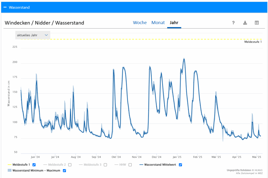 Die Daten und Grafen für den Pegel der Nidder am Meßpunkt in Windecken hole beim Hessisches Landesamt für Naturschutz, Umwelt und Geologie per iframe ab.