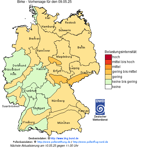 Die Daten und Karten für den Pollenflug hole ich tagesaktuell per Link beim Deutschen Wetterdienst ab. Leider habe ich keinen anderen Anbieter gefunden, der sie mir Ortsbezogen für unsere Region und grafisch ordentlich aufbereitete Ausgeben anbieten kann.